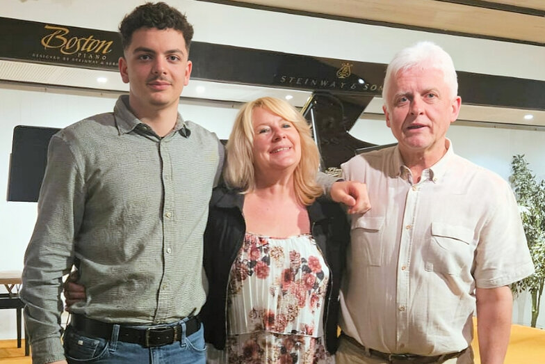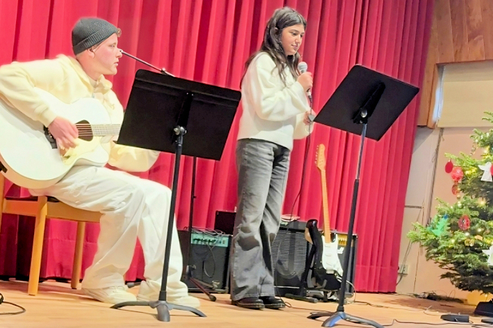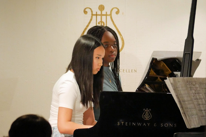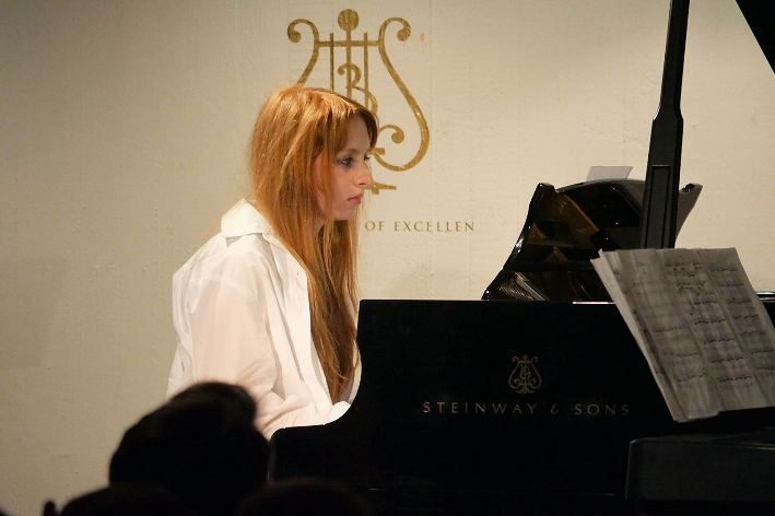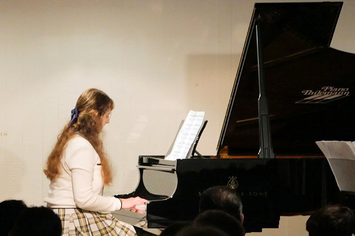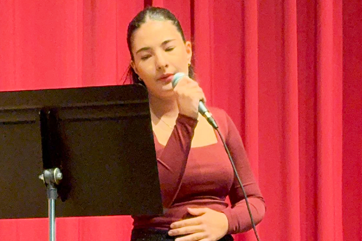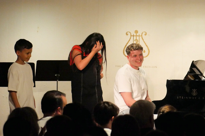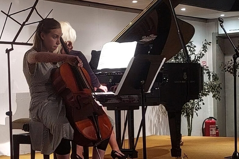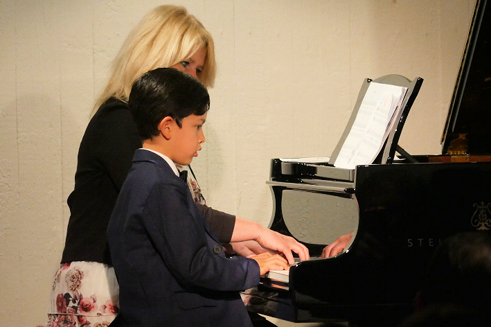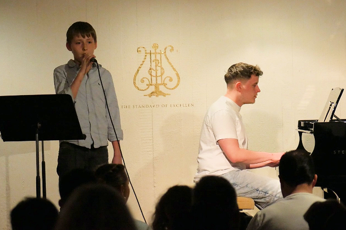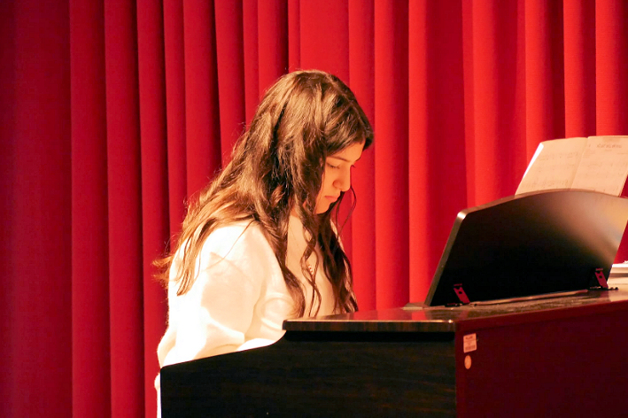 Ein Garant für Qualität im Bereich Popgesang: Malte Grimm, Sohn von Frau Kindl, dessen Schülerin sich mit „Heartbreak Anniversary „ ins Herz des Publikums sang. Danach kam sein eigener locker und lässig dargebrachter Song zum Vortrag, der in die Kategorie „ Vollprofi“ gehört. Folgt der langjährige Schüler am Klavier, der uns den „Chopin erklärte“ als Verfolgungsjagd durch seinen Traum und danach spielte wie ein junger Gott. Als er fertig war lockte er seine Lehrerin Edna Kindl mit Rhythmen von „Cia, bella ciao“ zu ihm ans Klavier, damit sie im Stehen mit ihm gemeinsam improvisierte. Ein herrlicher Abschluss seines Vortrags!