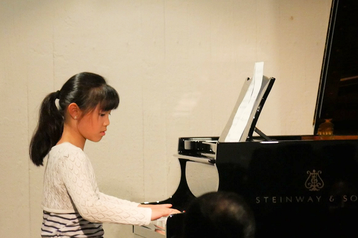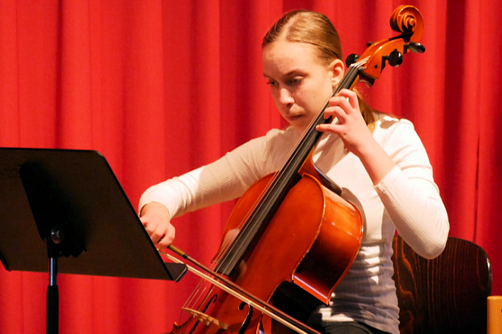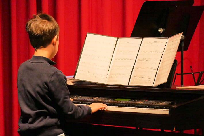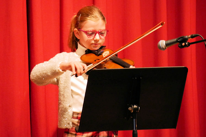 Oder die Mädchen zu zweit am Klavier, die erst einmal „richtig Stimmung“ machen wollten und dann im Publikum Instrumente zum Mitspielen verteilten. Tolle Beiträge an der Ukulele und Gitarre, auch mit Gesang, von den Lehrern und Lehrerinnen so kindgerecht einstudiert und einfallsreich dargebracht, dass es eine Freude war. Klavier vierhändig, Schüler/innen miteinander musikalisch zusammenbringen, das schien eines der Themen des Nachmittags zu sein. Erst eine solo Tarantella, dann Boogie zu zwei. Sogar die Allerkleinsten durften mitmachen: Ihr „Mango, Mango“ machte auf Anhieb gute Laune! Als „Klaviervater“ habe ich viel neues kennengelernt: Das Cello- das mir bisher nur namentlich ein Begriff war. Wie hier junge Schülerinnen hinter einem so riesigen Instrument sitzen und diesem Töne entlocken hat mich sehr beeindruckt. Die Violinen in Einzelbeiträgen und in der Gruppe spielten schöne Melodien, fetzige „Fluch der Karibik Musik“ und zeigten uns mit ihrem „Europa-Medley“, dass Musik die Menschen verbindet. Es gab Vorträge, die Staunen machten. So der Junge im Grundschulalter, der seine eigene Komposition am Klavier vortrug. Mehrere Notenseiten wurden ausgebreitet, gedreht und gewendet, bevor das Werk zur Uraufführung gelangte. Riesiger Applaus belohnte ihn.