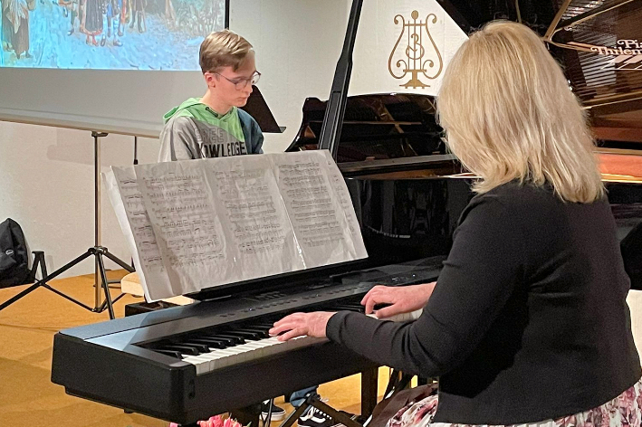 Ein Garant für Qualität im Bereich Popgesang: Malte Grimm, Sohn von Frau Kindl, dessen Schülerin sich mit „Heartbreak Anniversary „ ins Herz des Publikums sang. Danach kam sein eigener locker und lässig dargebrachter Song zum Vortrag, der in die Kategorie „ Vollprofi“ gehört. Folgt der langjährige Schüler am Klavier, der uns den „Chopin erklärte“ als Verfolgungsjagd durch seinen Traum und danach spielte wie ein junger Gott. Als er fertig war lockte er seine Lehrerin Edna Kindl mit Rhythmen von „Cia, bella ciao“ zu ihm ans Klavier, damit sie im Stehen mit ihm gemeinsam improvisierte. Ein herrlicher Abschluss seines Vortrags!